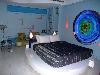 戶外植栽區的右邊是臥室區, 有床, 50吋大TV (大同的) 附VOD , 休憩區, KTV (美華系統), DVD機, 衣櫃, MINI BAR (沒放泡麵, 但有需要可叫櫃台送來). 臥室區的設備也是很豐富, 只是VOD系統跑的時候有點不靈敏, 另外如果電視和VOD的搖控器能整合成一支就更完美了. 這區比較特別的是床旁邊的壁面上有一大圓形的七彩琉璃, 搭配休憩區的彩色情境燈, 整個就是一個浪漫....