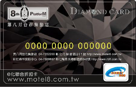第八月台為了服務廣大的顧客,現正熱烈發行『第八月台鑽石卡』預付儲值卡,您只需帶著一張卡,到【第八月台市集旅店】、【彩虹森林渡假中心】,即可輕輕鬆鬆從卡內扣款消費,同時獨享尊榮優惠價格。