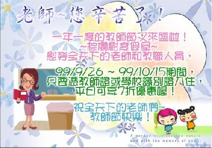教職人員優惠專案~ 9/26~10/15平日住房7折 (此優惠活動已經過期)