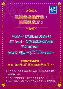 夜貓族省錢行動專案 1、凡於平日凌晨24:00後進住SLv Motel、香格里拉汽車旅館中和館旅客,房租以售價折$200元優惠。 2、平日定義: 每週日24:00~週六08:00,每週六及特殊假日,不適用此方案。 3、特惠專案折價優惠不得與他項方案重複。
