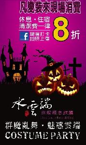 Happy Halloween! 萬聖變裝狂歡週~不給折扣就搗蛋! 活動開始日:103/10/20(一) 活動結束日:103/10/31(五) 凡變裝前來現場即可享有休息/住宿/party清潔費---全面8折優惠!!! **10/25週六不適用** 水雲端讓您擁有難忘的萬~聖~狂~歡