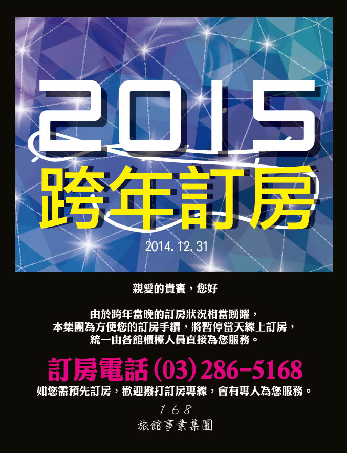 由於 跨年當晚 的訂房狀況相當踴躍, 168集團 為方便您的訂房手續,將 暫停當天線上訂房, 統一由各館櫃檯人員直接為您服務。 訂房電話 (03) 286-5168 如您需預先訂房,歡迎撥打訂房專線,會有專人為您服務。