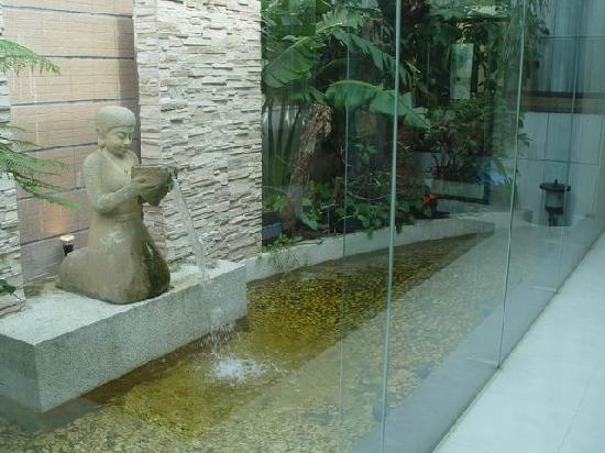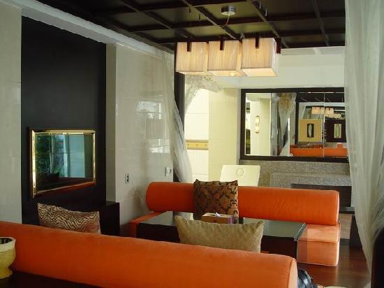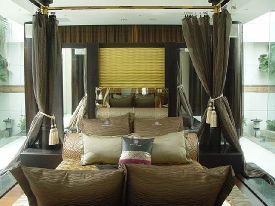 4.床:這部份的兩邊是用透明玻璃圍起來的,很浪漫,男友說要是他睡這可能睡不著吧!因為玻璃外面也是露天的,也有小水池和擺設。這裡也有台40吋電漿電視(竟然有三台電視!)床的後面是書桌。